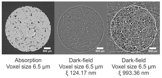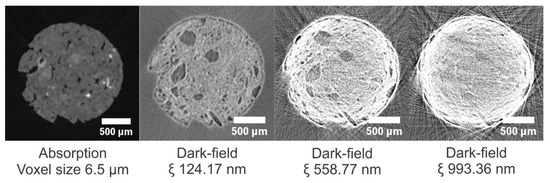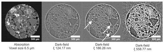 In Figure 12, cross sections through the absorption dataset and corresponding dark-field datasets are given. The quartz grains in the material are difficult to distinguish in the absorption image, but are clear in the dark-field image owing to their homogeneous structure, whereas the pores can be seen in the absorption mode, but are masked in the dark-field mode. In Supplementary Figure S2, cross sections at additional correlation lengths are shown.