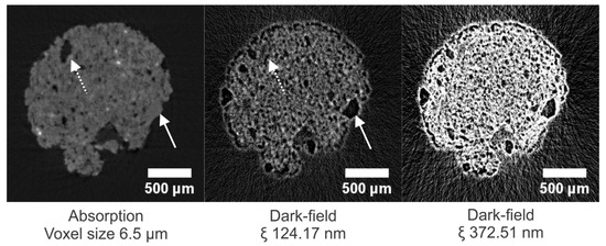 In Figure 11, cross sections through the absorption dataset and corresponding dark-field datasets at CLs of 124.17 nm and 372.51 nm, respectively, are given (additional correlation lengths are shown in Supplementary Figure S1). In the absorption image, a quartz grain (indicated with a solid white arrow) is almost indistinguishable from the porous matrix based on its X-ray attenuation. However, having a homogeneous structure, a quartz grain causes less X-ray scattering in comparison with the porous fired clay bulk mass of the sample. Therefore, in the dark-field image, this bulk mass is observed to appear much brighter than the quartz grain. Large pores, on the other hand, which appear black in the absorption image (indicated with the dashed arrow), were also expected to cause no scattering and show no signal in the dark-field image. However, this is not the case. A possible explanation is a strong scattering caused by the pore-to-air interface determining the dark-field signal. At this location, scattering is caused by both the large density difference between matter and air and by surface roughness.