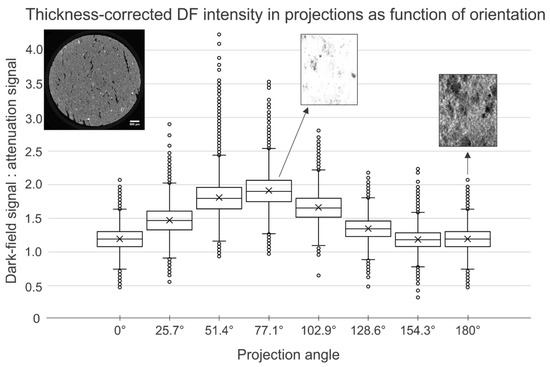 When the dark-field projections were investigated, it was noted that the scattering intensity (observed as brightness) was not uniform over the projections (acquired over 180°). In Figure 13, the image intensity in the sample was plotted for eight projections evenly spread over the 180°. The observation of angle-dependent dark-field signal, indicative of angle-dependent scattering, could be explained by the anisotropic structure inside the TL sample. In contrast to the fired clay brick TB, the TL sample was compressed using a press. This results in flattened pores instead of isotropic pores. This anisotropy can already be seen in µCT (Figure 13, upper left).