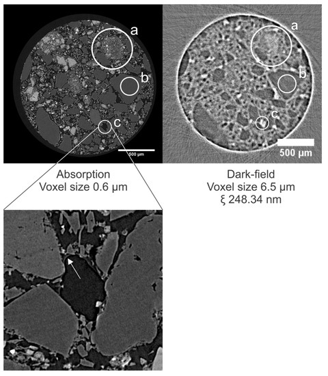 In Figure 14, a cross section through the absorption dataset of the sample and corresponding dark-field datasets at different correlation lengths is shown (cross sections through tomograms at additional CLs are shown in Figure S3). In the absorption tomograms, the quartz grains are uniformly gray, whereas the brighter gray values are caused by the steel slag residue. In the dark-field modality, the quartz grains can be distinguished easily by a low DF signal, as was the case in the brick (Figure 15, zone b). Grains of steel slag residue, having a heterogeneous composition, scatter X-rays, but the edges of the grains can hardly be distinguished in the dark-field modality (Figure 15, zone a). The cross sections in the dark-field tomograms at different correlation lengths in Figure 15 also show isolated regions that scatter more X-rays than their surroundings (Figure 15, zone c). Zooming in on these regions in the high-resolution tomograms (voxel sizes of 0.65 µm) indicated that these regions correspond to pore spaces that were not filled with resin, leaving a high difference in the refractive index between the air and the (hardened) resin. Combined with the surface roughness at the edge of the grains, this difference in the refractive index results in high amounts of X-rays being scattered at these locations. These local scattering zones are more distinguishable at lower correlation lengths (indicated in Figure 14 with white arrows at a CL of 186.26 nm); at higher correlation lengths (in Figure 14 at a CL of 558.77 nm), these zones are masked by scattering from other sources (e.g., grain boundaries, smaller pores).