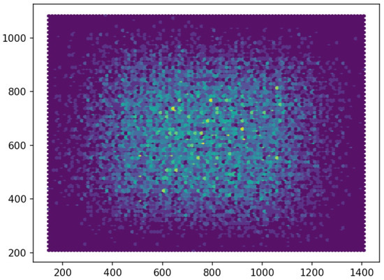 - After the shutter of the smartphone camera was released, the image was processed programmatically from the RAW format, as a result of which the final image was cropped, which was not displayed on the smartphone screen at the time of shooting. Thus, it was difficult to obtain a board at the edge of the image, where the distortion is known to be maximal. An example histogram of the distribution of board cells corners in the original image is shown in Figure 3.