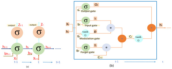 where g is an elementwise nonlinearity, such as a sigmoid function or hyperbolic tangent, is an input, ∈ is a hidden state with N hidden units, and is the output at time t. For the length of the T input sequence , the update carried out is to calculate sequentially by ignoring