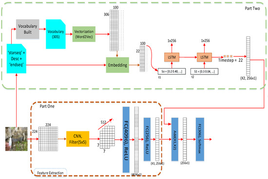 Figure 3 depicts a geology caption model and divides the model into parts, such as image extraction, word embedding, generating words, and assembling the captions. The image extraction part is in part one and word embedding is in part two. The outcome units are 256 units for each learning stage. We concatenated both outcomes between image extraction and the LSTM unit. Furthermore, after compiling using an ADAM optimizer with learning = 0.0001, we acquired 12,746,112, 2,397,504, 20,482,432, and 104,867,300 training parameters for CNN-A, CNN-B, CNN-C, and CNN-D, respectively. These parameters were achieved from the reengineering of VGG16 and word embedding [2].