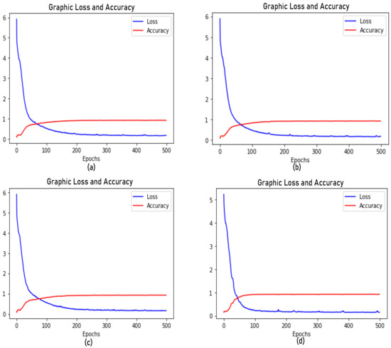 Accuracy and loss graphs of the proposed models: (a) CNN-A, (b) CNN-B, (c) CNN-C, and (d) CNN-D. The experiments used 500 epochs as a training measure. The graphs show that each model needed just below 100 epochs to reach its best accuracy.