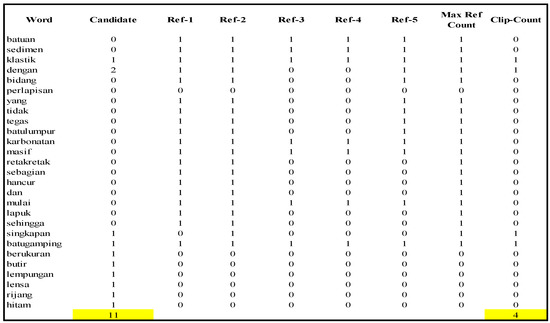 Here, we have written an illustration for measuring a caption. For instance, we acquired a caption, such as “singkapan batugamping klastik dengan berukuran butir lempungan dengan lensa rijang” in Indonesian. We calculated the BLEU score by the following algorithm [60]: