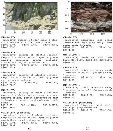Examples of generated captions for geological captioning, translation into English. B@N is the BLEU score. (a) Sedimentary rock image; (b) limestone image on a different surface.