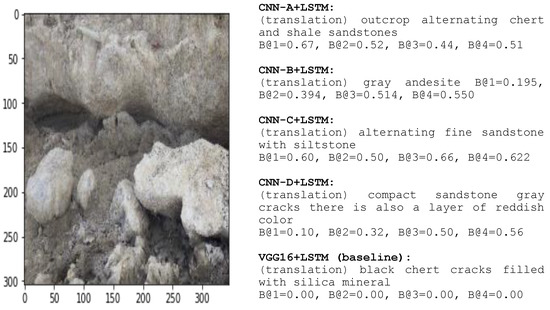 Figure 9 shows an error caption and compares VGG16 + Word2Vec + LSTM to our models [69]. This study successfully presented an error result from the baseline. It proves that many CNN layers do not always acquire the best outcome; indeed, the result is sometimes a mistake. The image in Figure 9 is of sandstone. Nevertheless, the baseline presented a mistake caption of chert. Many parameters produced the feature that caused VGG16 difficulty to pairwise between the word and the feature maps. Geological rock images always show a variety of color within the rocks and color differentiation is necessary to separately identify the rocks.