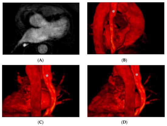 CMR images depicting the anatomical relationship between the esophagus (indicated with the asterisk): Panel (A): axial plane, angiographic CMR acquisition; panel (B–D) 3D volume rendering.