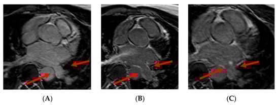 Different studies [37,43] have confirmed the high diagnostic accuracy of late gadolinium enhancement CMR (LGE-CMR) to detect ETI and assessing its extent and progression. The severity of ETI evaluated with LGE-CMR can be classified as none, mild, minimal, moderate, and severe. All cases of ETI confirmed by esophagogastroduodenoscopy (EGD) presented moderate or severe LGE on CMR. Compared to EGD, CMR could provide a more detailed characterization of the wall of the esophagus, showing edema on double inversion recovery (IR) T2 weighted turbo spin-echo (TSE) images and enhancement on LGE-CMR images, suggestive for wall flogosis, probably an early sign ETI. The study also demonstrated that on repeated LGE-CMR scans the severity of ETI significantly decreases reflecting the resolution of the transient esophageal lesion.