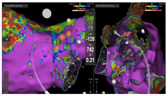 - Parmar, B.R.; Jarrett, T.R.; Kholmovski, E.G.; Hu, N.; Parker, D.; MacLeod, R.S.; Marrouche, N.F.; Ranjan, R. Poor Scar Formation after Ablation Is Associated with Atrial Fibrillation Recurrence. J. Interv. Card. Electrophysiol. 2015, 44, 247–256. [Google Scholar] [CrossRef] [PubMed]