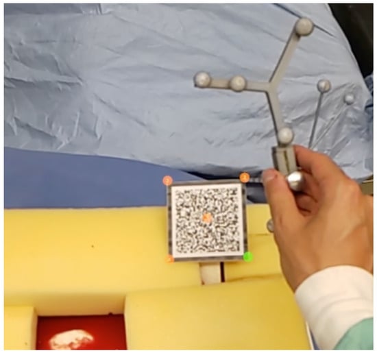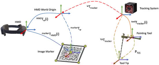 Due to the limitations of image-based tracking accuracy and tracking volume on HMD, an outside-in tracking system was employed. However, the introduction of an external tracking system brought a new coordinate frame to the setup. Therefore, a calibration procedure to register the HMD to the tracking system needed to be performed, as shown in Figure 1. We first defined five unique points on a image marker that can be tracked by the HMD. Then, we used a tool tracked by the tracking system to mark the same point set, so that they were in the tracker coordinate frame as . Therefore, we could use the point cloud registration method to solve the transformation between two point sets, which essentially solves the following equation: