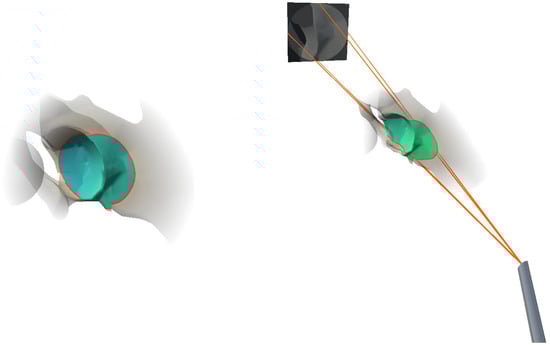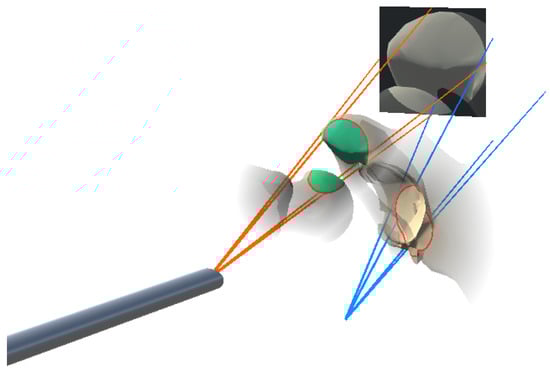 and are the RGB color values associated with the camera center and the far clipping plane, and were set to (0.05, 0.9, 0.05) and (0.05, 0.05, 0.9), respectively. We chose the RGB color values of and to interpolate the color of the bone vertices in the frustum between a blue color tone at the far clipping plane and a green color tone at the near clipping plane. The final visualization of the anatomical area and the integration of the endoscope frustum is illustrated in Figure 3. All visualizations were implemented in a fragment shader program on the GPU.