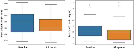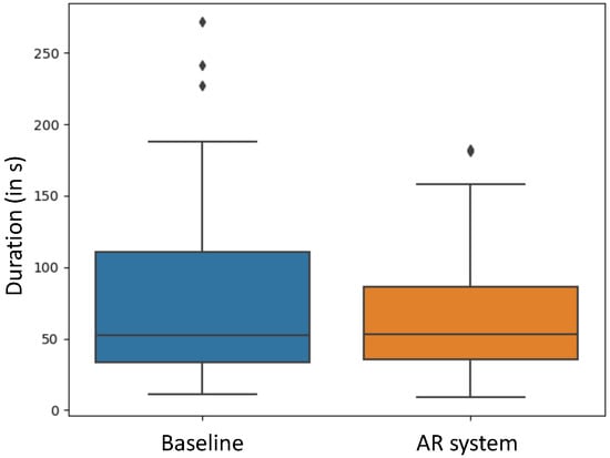 As shown in Figure 8, performing the positioning tasks took, on average, s for the baseline positioning, while, for the AR-guided system, an average elapsed time of s was measured. In addition, the t-test did not reveal statistical significance for the time to complete the alignment task (p = 0.3466).