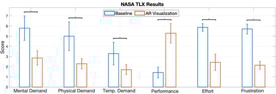 We used NASA-TLX to subjectively evaluate the task load of the alignment task with and without AR visualization, and the results are shown in Figure 9. As demonstrated in the chart, the mental demand, physical demand, temporal demand, and effort level were perceived to be lower in the study with AR. In addition, the performance of alignment was perceived to be better with AR visualization, considering the average value. Considering the non-normal distribution of the task load index data, we applied a one-sided Wilcoxon signed rank test with for the subjective measures. The statistical results showed that the mental demand (p = 0.0156), physical demand (p = 0.0156), temporal demand (p = 0.0156), the effort level (p = 0.0078) and the frustration (p = 0.0078) were significantly reduced, while the performance significantly increased (p = 0.0078).