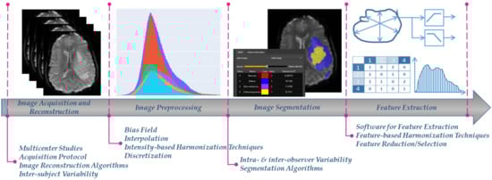 Radiomics, a rapidly evolving field in medical image analysis, aims to enable digital decoding of images into high-throughput quantitative features, aiding earlier and more precise care in clinical decision making [,]. It is applied in different medical image modalities, including magnetic resonance imaging (MRI), computed tomography (CT) and positron emission tomography (PET) based on the concept that images potentially contain hidden patterns of the underlying pathophysiology of the examined tissue [,]. The extracted image features are usually volume, shape, intensity or textural features, calculated using several mathematical equations from the image analysis domain []. Radiomics features are prone to bias and variability caused by a number of factors such as the: (i) acquisition protocols and image reconstruction settings, (ii) image preprocessing, (iii) detection and segmentation of the examined region of interest (ROI), and (iv) radiomics feature extraction (Figure 1) []. This can significantly influence the absolute value and the statistical distribution of the radiomics features, subsequently having a considerable impact on the robustness and generalizability of any further analysis derived from them.