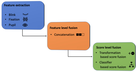 Once the data has been acquired, depending on the type of information available, it is possible to define different levels of fusion. These strategies can be divided into two macro-areas: pre-classification with a fusion before the matching (sensor level, feature level) and post-classification, with a fusion after the matching (score level, rank level, decision level). Feature level fusion is achieved by combining the different feature vectors that are extracted separately from each biometric trait. Concatenation or summation [8] are examples of this class of approaches. Sensor-level fusion is usually associated with a strategy of multi-sensor or multi-algorithm, where raw information is combined immediately after its acquisition. A rank-level fusion is applied when a ranked list of matching identities can be obtained from each algorithm [9]. The decision level fusion combines the answers of the different algorithms to obtain the final decision. The main advantage is that it is particularly suitable when only the final decision is available [10]. Score level fusion is a post-classification process in which the scores produced by different algorithms are combined [11]. In this work, using only the information provided by the periocular area, we investigated how effectively fusion approaches that combine pupils, fixations, and blinks, can estimate the gender and age group of users. The estimate of belonging to one of the two classes can be particularly useful as information to be integrated or as the only confidence estimator. In the first case, for example, it can be integrated to improve the performance of iris recognition techniques, while, in the second case, it can be a good estimator in the presence of partial occlusions in challenging contexts (such as, for example, during a pandemic epidemic when it is mandatory to wear a mask when carrying out common daily activities). To do this, a data fusion strategy is implemented (Figure 1). First, we adopted a concatenation scheme for fusion at the feature level while, at the score level, we applied and then evaluated the performance of transformation and classifier-based score fusion methods. The main contributions of the work can be summarised as follows: