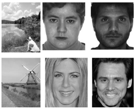 The experimental analysis was conducted on the GANT dataset [36]. A total of 112 volunteer participants (73 males and 39 females) took part in the experiment, divided as follows by age groups: 17–18 (11 subjects), 21–30 (58 subjects), 31–40 (9 subjects), 41–50 (16 subjects), 51–60 (8 subjects), 61–70 (9 subjects), and 71–80 (1 subject). All subjects had normal vision. Acquisitions were made using a Tobii 1750 remote eye tracker (1280 × 1024 screen resolution, 50 Hz sampling frequency). A total of 18 black-and-white pictures were randomly shown, 16 depicting human faces and 2 landscapes (examples in the Figure 2). The images of the faces are divided as follows: 8 of men, 8 of women, and for each division 4 are of famous people (such as actors) and the other 4 are of people unknown to the participants. All images have the same gray level distribution.