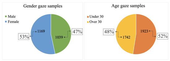 The saccade is a rapid eye movement performed to shift a peripheral region to the center of the visual field. The time between two saccades is generally called fixation. This characteristic indicates how people acquire information. It happens in a range varing from a few milliseconds to several seconds. A high number of fixations can suggest difficulties in interpreting information while their longer duration can have different interpretations: more demanding cognitive processes, greater interest, etc. In [22], the authors investigate the use of different fixation measures as memory indicators during facial recognition lies. They recorded fewer fixations when subjects voluntarily denied recognition of familiar faces than when they correctly pointed to faces that were not actually known to them. Moss et al. [23] extracted different eye features when participants were shown natural images. They observed how women, on average, tended to be more exploratory, making more fixations for those images where there were no faces. Furthermore, for heterosexual couples, it was observed that all participants preferentially stared at female figures, with a higher percentage recorded in women (61% for female figures; 39% for male figures) than men (53% for figures female; 47% for male figures). The fixations of men tended to focus only on the face, unlike the female ones which were more varied. The fixations in relation to the age have been little explored.