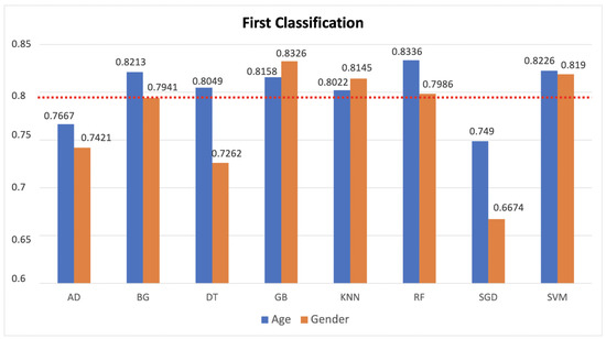 The results of the age and gender classification using different classifier. The accuracies over the red line are taken in considerations.