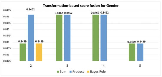 The results of combining 2, 3, 4, and 5 classifiers in gender recognition using sum, product and Bayes rule as fusion strategies.