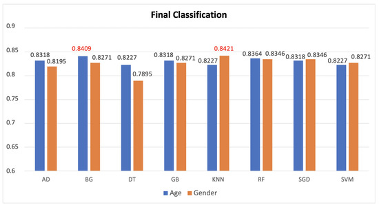 The highest accuracy for the combination was reported only when it actually exceeded the maximum accuracy reported in Figure 4 for each classification task. Another strategy, based on Bayesian rules, as explained in Section 3.1.3, was also applied for the transformation-based score fusion, combining the selected classifiers two by two. The best results are reported in Table 2 and Table 3. The second score level fusion technique implemented is the classifier based score fusion approach. The models chosen are the same ones used to obtain the scores. These classifiers were trained on a new train dataset obtained by concatenating the scores relating to the two classifiers that reported the highest accuracy in Figure 4. So, for age classification, we concatenated the scores of SVM and Random Forest, while for gender classification Gradient Boosting and SVM ones. The rate train:test chosen was 70:30. Additionally, in this case, an exhaustive research of the best parameters was applied and different k-fold strategies for the models were tested in order to obtain the best results reported in Figure 7.