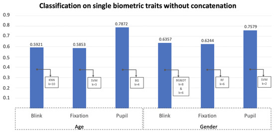 From this table, it is clear that of the three traits analyzed the pupil size is the most discriminating for both classification tasks. The blink and the fixations seem to perform poorer for the age classification showing comparable level of accuracy. For the gender classification, relating to blink, there are two classifiers (DT and BG) with which the same result is obtained. For this reason, the successive experiments were replicated using the scores of one and then those of the other. The combination of the scores of the classifiers through both the transformation and classification techniques are shown in the Table 4, Table 5, Table 6 and Table 7. By comparing the results of these tables with the final summary one (Table 8), it is possible to observe how, with the contribution of the concatenation, there is an increase in accuracy of almost 4% for the age classification and slightly higher for the gender. This is due to the initial accuracy which is significantly more unbalanced between the three biometric traits for the task of age classification. In any case, for gender it is necessary to take into account that in the score fusion the results shown in Figure 7 are related to the merger of the scores of the first two classifiers that gave the best results. In this case, in contrast, the best result (Table 5) is obtained by concatenating the scores of the three classifiers associated with the pupil, blinks, and fixations, respectively. Therefore, with the same accuracy reached, 84.21%, in the treatment without concatenation it is necessary to consider a greater number of classifiers to still have the same performance. Table 8 is a summary table of the results achieved. The best performances for both classification tasks are obtained in correspondence with the fusion strategy based on the transformation of the scores with respect to both the weighted sum and product, however, varying the number of algorithms involved. For the gender classification, to obtain the best performance, it is sufficient to consider only 2 classifiers and rely on the weighted product. Comparing the performances achieved with those in a previous work [19] it is evident that, only considering the pupil size higher performances are obtained by analyzing a smaller number of classifiers and no neural network models, e.g., multi-layer perceptron (useful pointing out that other statistical indices in addition to the average have bee used.) Through the proposed fusion strategy, feature level concatenation followed by transformation-based score fusion, the state of the art for gender classification using periocular features is exceeded by more than 25%. For the age classification, on the other hand, there is a slight increase. Although the maximum accuracy is reached with a neural network, if we refer to Table 5 of the paper [8] it is very evident that higher performances are obtained considering only the average and using the same classifier. Further studies may investigate which statistical indices are most appropriate and discriminatory for each task. However, a weighted sum of just three classifiers results in higher accuracy.