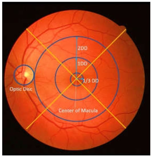 DME severity is measured with polar coordinates that are determined by the appearance of a hard exudate on the retinal fundus image and its distance to the macular area [2,3,4]. The center of the macular is used as the focus in this polar coordinate system [5,6], which helps in measuring the distance of the hard exudate when it appears. Therefore, macular center detection is considered the initial step for their determination [7]. Figure 1 shows a polar coordinate system for the appearance and distribution of hard exudate in the macular area.
