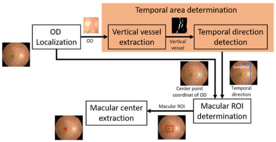 This paper also proposes an approach for obtaining the location of the macular center via determination of the optimum macular region of interest (ROI) based on the temporal direction. After the optic disc is detected, a feature for determining the temporal direction is extracted, which helps with accurate identification of the macular center location. The contributions of this study can be summarized as follows: