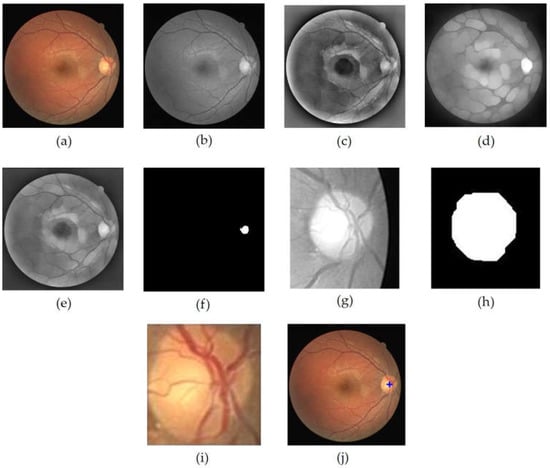 The OD ROI was further processed to obtain the optic disc. The process began with contrast enhancement using Contrast-Limited Adaptive Equalization (CLAHE) and continued with opening morphology to remove blood vessels. The next step was binarization of the resultant image using the Otsu’s threshold. In order to obtain the candidate blob of the OD, morphological closing morphology followed by morphological opening were performed. Disc-structuring elements of radius 10 and 15 were used in these morphological operations (Figure 3h). Then, the resulting image was cropped according to the bounding box of the blob to obtain the OD (Figure 3i). The cropped optic disc image was called I O D and was used in the process of determining the temporal direction. Furthermore, the center point of the blob was determined to be the center point of the OD, which was then plotted on the retinal image to show the results of OD localization (Figure 3j). Figure 3 shows the series of results for the OD localization.