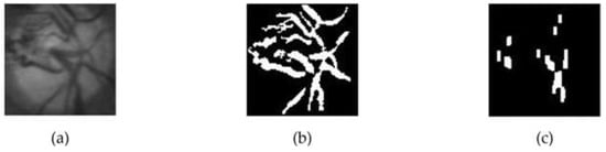 Figure 5. The extraction process of blood vessels on the optic disc; (a) optic disc on the green layer; (b) the extraction result of blood vessels on the optic disc; (c) the result of elimination of horizontal blood vessels.
