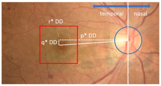 As shown in Figure 6, the ROI of the macula was determined in the form of a square shape with a size of r × DD, where r was the ROI box factor. In this study, the best values of the parameters p, q, and r were selected through parameter tuning, with possible values of p = {3.6, 3.8, 4.0}, q = {0,25, 0,5}, and r = {2.0, 2.25, 2.5}.