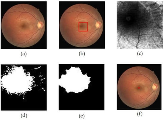 10. Sedai, S.; Tennakoon, R.; Roy, P.; Cao, K.; Garnavi, R. Multi-stage segmentation of the fovea in retinal fundus images using fully Convolutional Neural Networks. In Proceedings of the 2017 IEEE 14th International Symposium on Biomedical Imaging (ISBI 2017), Melbourne, VIC, Australia, 18–21 April 2017. [Google Scholar]