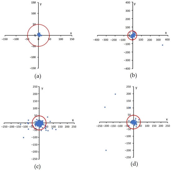 Figure 8. Euclidian distance distribution between the proposed method with GT. A red circle with a radius of 50 shows the acceptable distance limit for well-detected results, (a) DRIVE, (b) DiaretDB1, (c) Messidor, and (d) JOGED.com (accessed on 22 July 2022).
