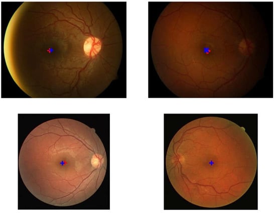 These results were plotted on a Cartesian diagram, as shown in Figure 8. The ground truth value validated by experts was employed as the center point of the coordinates, while the points on the diagram showed the distribution of the points generated by the proposed method. In addition, a red circle with a radius of 50 indicated the acceptable distance limit for well-detected results. Therefore, the point distribution in this diagram showed the distribution of the accuracy of the proposed method in detecting the center of the macula in a dataset. There were several points that lie outside the red circle, as shown in Figure 8b–d. These points showed the coordinates of the macular center points that were not precisely detected. Examples of detection results are presented in Figure 9.