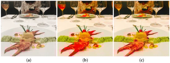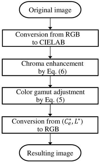 where is an approximation of the maximum chroma in the color gamut, defined by , and h and is obtained from a lookup table using the method in Ref. [15]. Finally, the enhanced CIELAB color components are converted into RGB color components to obtain the resulting images [15]. Figure 2 shows the effects of the gamut correction using Equation (5).