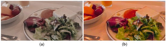 Experiments were conducted to illustrate the performance of the proposed method using digital food images. Parameters , , MIN, and MAX are set as to 3, 0.1, 0.2, and 0.8, respectively. is 72, which is the average value of h, using the top 100 ranking photos posted as of April 2021 on the SNS site “SnapDish”, which specializes in cooking [21]. The problem in this calculation is that the values of h differ greatly between −180 and 180, even though they have almost the same hue. Therefore, is determined using the following equation: