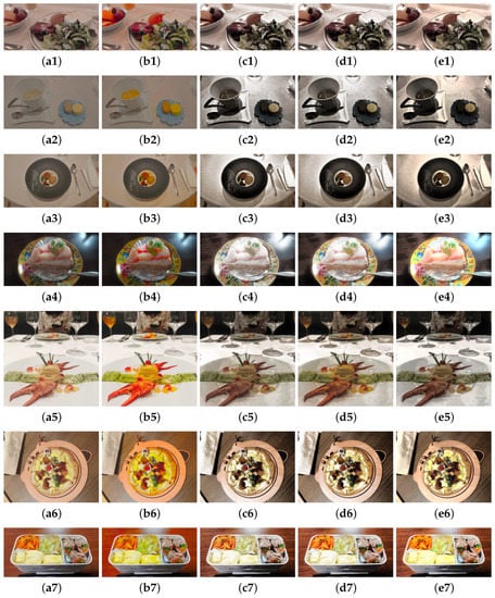 Figure 6 shows the experimental results of seven digital images. These are 24-bit color images (1) 1015 × 501 pixels, (2) 1920 × 1080 pixels, (3) 1919 × 1080 pixels, (4) 1706 × 960 pixels, (5) 1280 × 1280 pixels, (6) 1478 × 1108 pixels, and (7) 1280 × 664 pixels in size, respectively. The first column shows the original images, the second column shows the resulting images using the proposed method, and the third, fourth, and fifth columns show the resulting images using the methods in Ref. [2], in Ref. [6], and in Refs. [12,13]. In (b1), the unnatural coloring of whitish colors is improved compared with (b) in Figure 3. In (b2) and (b3), the chroma of the sweets is appropriately enhanced, whereas the blue and gray dishes remain nearly identical. In (b4) and (b5), the cake and crab are vivid, whereas the brown and white tables are largely unaffected. In (b6) and (b7), the yellow areas are effectively brightened. In addition, we can see that the proposed method provides sufficient color enhancement compared to the comparison methods. However, the resulting image of (e4) is vivid compared with (b4), which was obtained by the proposed method. In the experiments, the same parameters were used for all images. This was done to demonstrate the versatility of the proposed method. However, to further improve the performance of the proposed method, it is necessary to consider a scheme by changing the parameters based on the statistics of the input image.