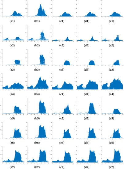 Experimental results. First column (a1–a7): original images. Second column (b1–b7): resulting images using the proposed method with Equation (6). Third column (c1–c7): resulting images using the method in Ref. [2] using histogram equalization. Fourth column (d1–d7): resulting images using the method in Ref. [6] using histogram equalization. Fifth column (e1–e7): resulting images using the method in Refs. [12,13].