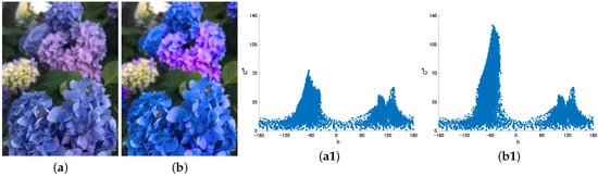 Experimental results. (a) Original image and its scatter plot of hue and chroma (a1). (b) Resulting image using the proposed method with Equation (6) and its scatter plot of hue and chroma (b1).