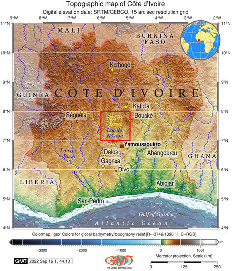 Côte d’Ivoire is notable for a diverse terrain structure which has two distinct parts: a coastal region formed by the alluvium and marine sands and a continental region with hilly relief [91]. The land cover types are associated with two major ecosystem types: forests distributed in the southern part of the country and savannah to the north off Bouaké [92]. The vegetation types are largely controlled by the equatorial or subequatorial rainfall regime. A long dry season is typical for the northern half of Côte d’Ivoire with dominating savannahs, while a tropical regime characterises the southern part of the country with prevailing forests [93]. A favourable climatic and environmental setting maintains the farming and agricultural activities of the local population. This makes Côte d’Ivoire the largest cocoa producer in the world [94,95,96,97] and an active exporter of food-producing crops [98], such as coffee, bananas, pineapples and palm oil [99]. Aside from agriculture, the activities of population include exploration, mining [100,101,102] and limited fishing along the narrow continental shelf of the Atlantic Ocean [103].