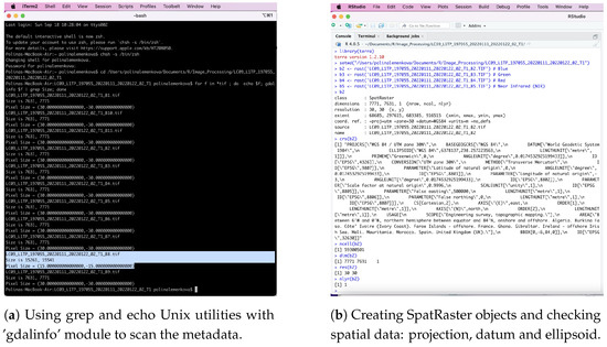 To cope with a series of Landsat bands and search for metadata, we examined the image parameters using regular expression with the command line utilities of Unix as a combination of grep, the Geospatial Data Abstraction Library (GDAL) and echo (Listing 1). Here, grep searches for text in a file according to a given pattern of characters, the GDAL filters spatial information in the dataset, and echo outputs the strings using the defined arguments.