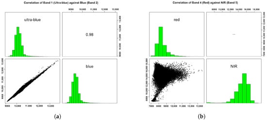 Correlation between the selected Landsat-8 OLI/TIRS C1 bands in a multispectral image LC09_L1TP_197055_20220111_20220122_02_T1_B. (a) Band 1 against Band 2. (b) Band 4 against Band 5.
