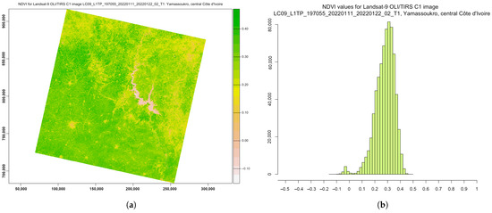 NDVI computed for multispectral Landsat-9 OLI/TIRS image. (a) NDVI ratio-based vegetation index. (b) Data distribution within the computed NDVI.