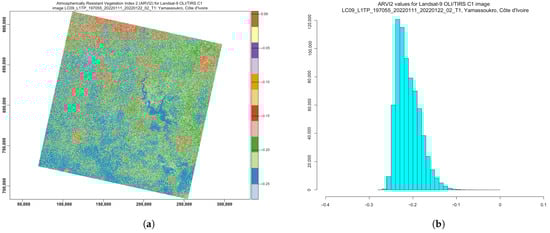 The most widely used and well-known vegetation index is the Normalised Difference Vegetation Index (NDVI), which applies the ratio of the difference in values between the red and NIR bands and their sum. Similar to the NDVI, the Enhanced Vegetation Index (EVI) quantifies vegetation greenness with added corrections for the atmospheric conditions and canopy background noise. Aside from that, the EVI is more sensitive in forest areas with more dense canopies and vegetation coverage, which is useful for the forest regions of Côte d’Ivoire. The Soil-Adjusted Vegetation Index (SAVI) is built up by using the NDVI and correcting for the effects of soil brightness in the regions where vegetative cover is low, namely deforested areas and the fragmented savannahs of Côte d’Ivoire. The Atmospherically Resistant Vegetation Index 2 (ARVI2) is the most applicable index in regions with high atmospheric aerosol contents. Examples of other environmental indices include the Normalized Difference Water Index (NDWI), modified Normalized Difference Water Index (MNDWI) and Water Ratio Index (WRI) [125].