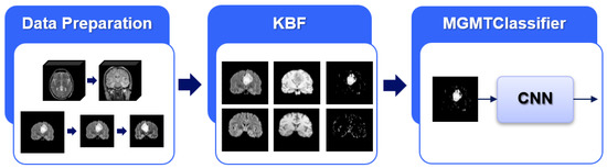 Exemplified schema of the proposed approach: on the left, the Data Preparation step generates isotropic and normalized acquisitions; in the middle, the Knowledge-Based Filtering (KBF) step leverages the medical knowledge to pre-select, in an unsupervised manner, the ROI corresponding to suspect lesions; on the right, the MGMT promoter methylation identification step adopts a CNN for the identification of the methylation process.