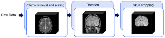 Illustration of the processes involved within the “Data Preparation” step.The volume retrieval and scaling create the 3D acquisitions with the isotropic dimension of mm; the Rotation step creates a set of volumes in the sagittal projection; the Skull stripping removes the tissue outside the brain.