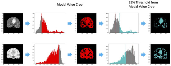 As described in Section 2, determining the ROI representing the tumor region when the segmentation mask is not available is a crucial step. In this work, we propose to select the area of interest in an unsupervised manner, leveraging past medical experience as proposed in [22,23] for tumor recognition. In particular, we exploit two very simple characteristics of lesioned tissues in the considered series: in T1-W slices, tumor areas have pixels whose intensity is higher than cerebrospinal fluids but lower than any other kind of tissue; in FLAIR slices, pixels with the highest intensity belong to the tumor region. Leveraging these characteristics, from each input volume it is possible to preselect potentially lesioned tissues by applying a threshold on the histogram of the signal intensities occurrences. Since tumor areas are characterized by pixels with high intensity in the FLAIR and low values in the T1-W, the most common value in terms of signal intensity (mode) can be used to split the available information and remove one of the two generated subareas. In particular, pixels with an intensity higher than the mode are considered in the FLAIR acquisition, while pixels with an intensity lower than the mode are retained in the T1-w volume. Then, the remaining pixels are sorted by the intensity value and undergo a further threshold operation, which considers the 25% of the highest and the 25% of the lowest values in the FLAIR and T1-w acquisition, respectively. Figure 3 provides an illustrative example of the threshold operations implemented in Knowledge-Based Filtering (KBF). Non-significant values in terms of intensity near the intensity modal value are removed, as they are very unlikely to represent tumor areas. Since tumor pixels have high intensity on FLAIR and low intensity on T1-w, a cross-intersection between the highest values of the first and lowest values of the second acquisition is required. Despite this possibly causing the loss of some pixels for the tumor due to their similarity with those of cerebrospinal fluids in T1-W, this is not a real concern in our case, as the main aim of the procedure is to localize the tumor and not to perform a pixel-level segmentation. The output of this process is a mask consisting of huge clusters corresponding to the ROIs (i.e., possibly lesioned areas) and little outliers if the slice has a tumor or sparse outliers in the opposite case. Figure 4 shows an example of KBF application on two MRI acquisitions belonging to patients with and without cancer, respectively. The resulting ROI is used to select from the FLAIR sequence the portion of the image to be considered by the actual methylation detection module, implementing a point-wise multiplication. We chose the FLAIR sequence for the good performance shown in the literature for tasks related to lesion diagnosis [24,25].