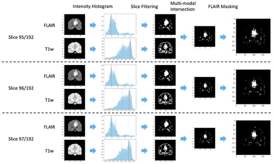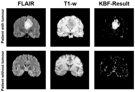 The proposed KBF module aims to compensate for the lack of segmentation masks, reducing the effort required by the physicians and making our methodology applicable to datasets where tumor areas are not identified. The KBF exploits properties of T1-w and FLAIR sequences, resulting in a multi-modal knowledge-based pre-processing procedure. In particular, we implement an early fusion technique, in which information coming from multiple sources is merged to highlight different characteristics [26]. In this paper, the two sequences are exploited to create a mask representing the area to consider. Figure 5 summarizes the KBF procedure, showing the results on three central slices.