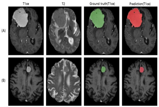 Although our model showed good performance in clinically diverse lesions, the frequencies of such appearances were limited in our dataset. Hence, the performance of the test samples fluctuated to some extent. It was especially poor in cases of meningioma with heterogeneous enhancement. As shown in Figure 2A, heterogeneous enhancement due to necrosis was observed inside the tumor, and the predictive performance of the model for this subject had a Dice score of 0.34. Heterogeneous enhancement was also observed in Figure 2B, and the predictive performance of the model for this brain was a Dice score of 0.84. To overcome this issue, brain images including heterogeneous enhancement lesions should be collected and used to train models. If the model matures enough to handle the primary task—meningioma segmentation—then we believe that the model can be further improved, which would also help explain various features of meningioma [].
