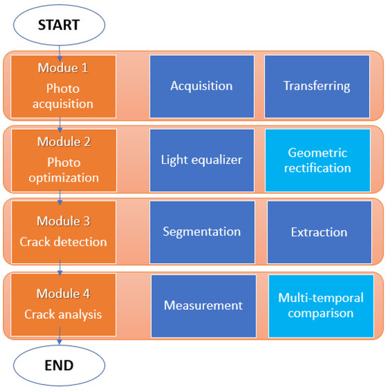 The radiometric optimization is implemented using an open-source software, namely ImageJ [39]. This software is user-friendly, contains a manifold of tools and plugins for image processing and allows for creating a macro for batch processing and, thus, automation. The first step for radiometric optimization is to convert the original RGB image to greyscale (8 bit). The application of the algorithms is to subtract the background (“Rolling Ball” plugin) and enhance the contrast, recalculate the pixel values of the original image to uniform brightness and increase smoothness. Parameters used in this study for the radiometric optimization are shown in Appendix A. As a result of the previous optimization steps, the obtained corrective image presents a smother distribution of pixel intensity, while maintaining information related to the presence of cracks.